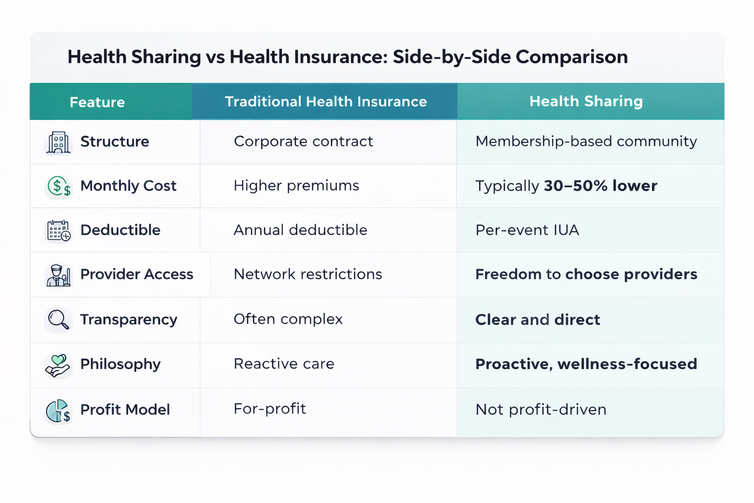 - Provider Choice: Most health share memberships allow you to see any licensed doctor or specialist without being restricted to a narrow PPO or HMO network.